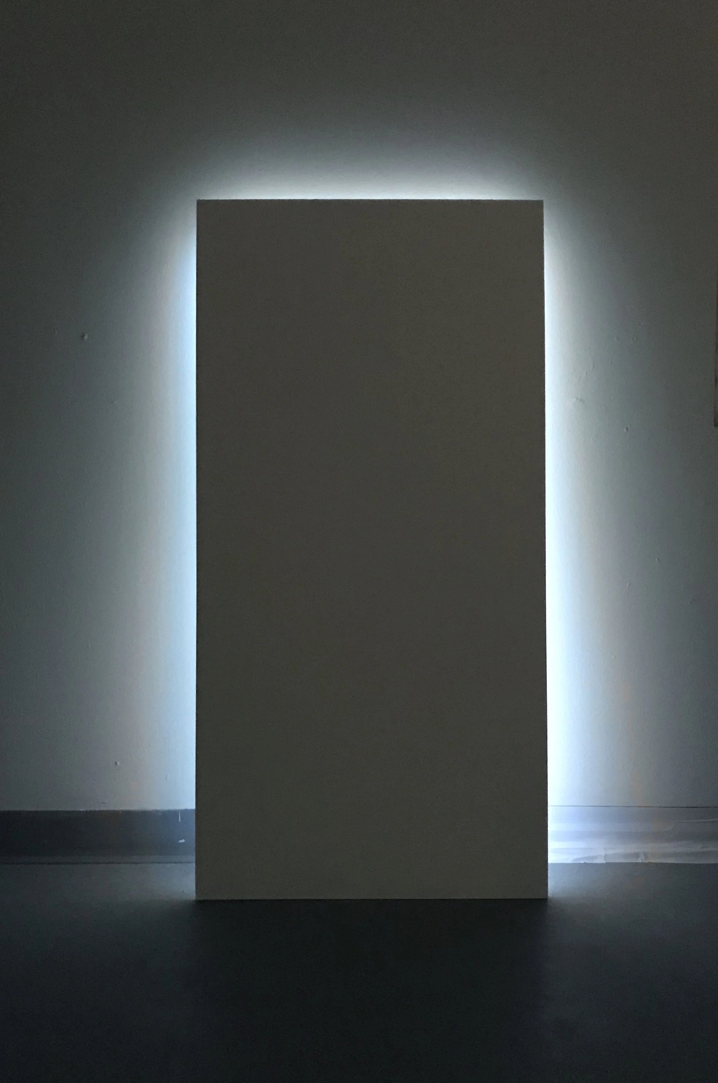 Installation, wood 24”x48”, led lights, exciter, sound loop approx. 4’, 2020.
